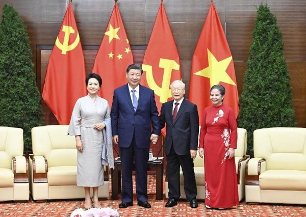 當地時間12月13日下午,在結束對越南進行國事訪問即將啟程回國之際,中共中央總書記、國家主席習近平和夫人彭麗媛同越共中央總書記阮富仲和夫人吳氏敏話別。新華社記者 申宏 攝