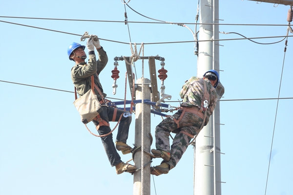 烈日下,電力工人用勤勞的雙手檢修著設(shè)備,他們用最樸實(shí)的行動和最火熱的激情履行著電力工人的職責(zé),用辛勤的汗水守護(hù)萬家燈火。(賈建榮 攝)