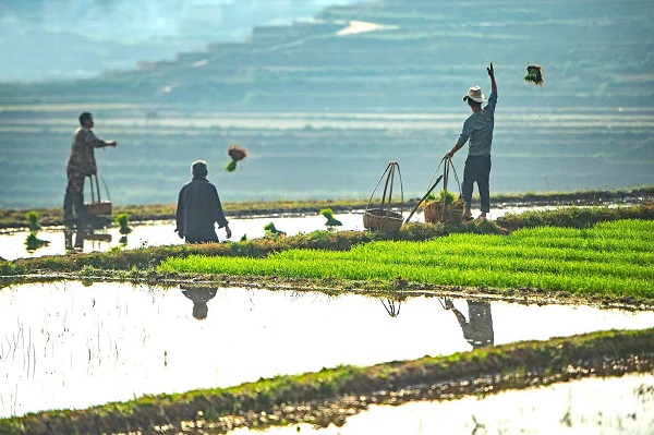 不負(fù)春光忙農(nóng)事。春日,田間地頭一片生機(jī)盎然的繁忙景象。圖為云南省文山市薄竹鎮(zhèn)農(nóng)民在田間拋秧,準(zhǔn)備移栽。(熊平祥攝)