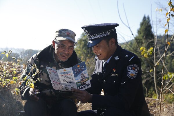 騰沖市公安局民警節(jié)假不休假,深入鄉(xiāng)村一線,為群眾宣傳、講解謹(jǐn)防電信詐騙的知識。(楊根蔚 攝)