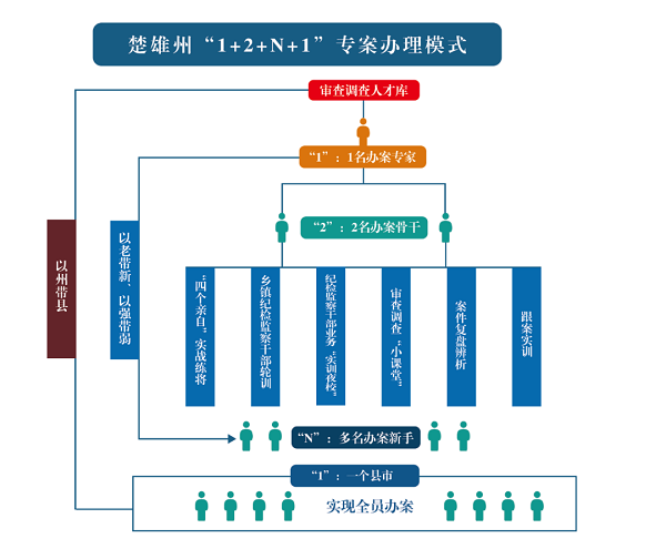 近年來,楚雄州探索建立了“1+2+N+1”辦案模式,通過“1對(duì)1”“1對(duì)多”“多對(duì)1”等方式,重點(diǎn)對(duì)45周歲以下和新入職的紀(jì)檢監(jiān)察干部分階段有重點(diǎn)地進(jìn)行審查調(diào)查業(yè)務(wù)幫帶指導(dǎo),著力鍛造一支業(yè)務(wù)精、能力強(qiáng)的審查調(diào)查干部隊(duì)伍,為全州紀(jì)檢監(jiān)察機(jī)關(guān)審查調(diào)查工作注入強(qiáng)勁動(dòng)力,力爭(zhēng)跑出案件查辦加速度。