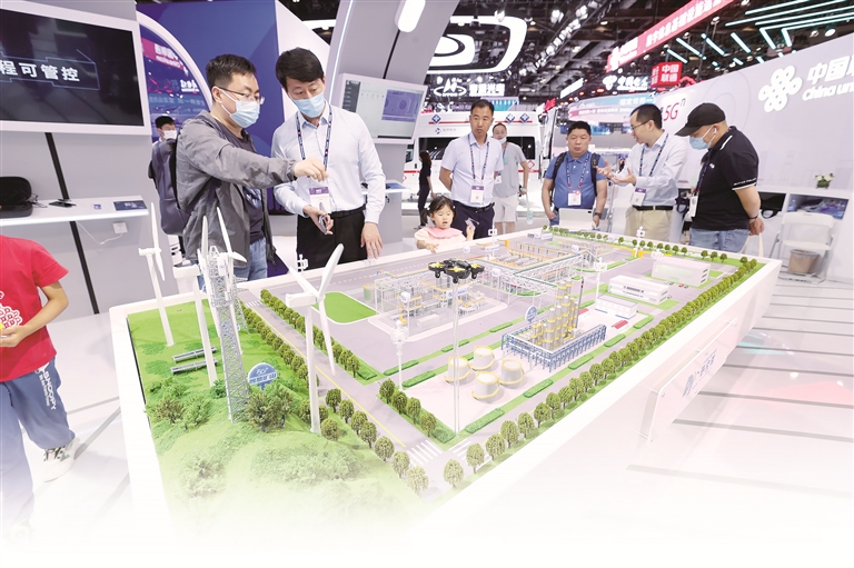 6月4日,第31屆中國國際信息通信展覽會開幕,集中展示數字設施、數字技術、數字應用、數字終端、數字治理等方面的創新成果。圖為工作人員介紹5G+工業互聯網應用場景模型。圖片來源 視覺中國