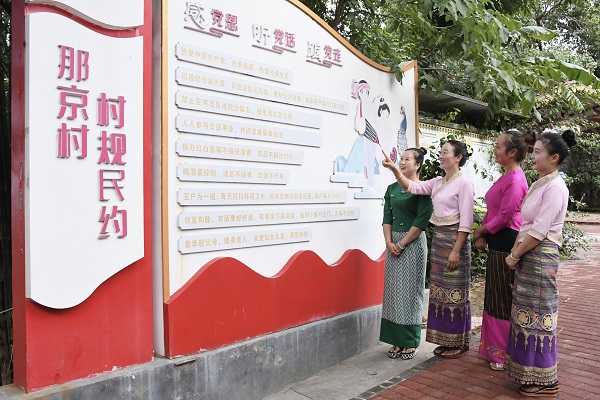 在“清廉村居”建設(shè)中,雙江縣充分發(fā)揮黨員示范作用,帶頭推進移風(fēng)易俗,以“小我”影響“大家”,涵養(yǎng)文明新風(fēng),助推鄉(xiāng)村振興。圖為沙河鄉(xiāng)允俸村那京自然村婦女群眾結(jié)伴學(xué)習(xí)村規(guī)民約。(羅英芳 攝)