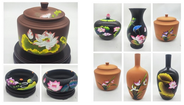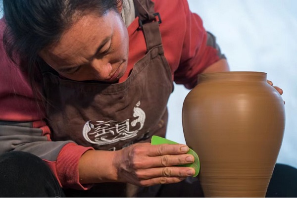 金雞土陶的制作共有采泥、晾曬、配泥、浸泡、和泥、沉浮、搓泥、拉坯、陰干、修坯、曬干、上釉、燒制、出窯、檢驗等工序。在給陶器上釉之前要取本地釉泥按比例混合“江塘灰”研磨、過濾配制釉液,這是核心的關鍵技藝。