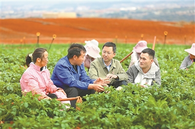 云南省陸良縣紀委監委緊盯惠農富農政策落實、農村集體“三資”管理、基層小微權力運行等重點環節,組織力量深入一線聽民聲、察實情,堅決整治群眾身邊不正之風和腐敗問題。圖為近日,該縣小百戶鎮紀委干部在普樂村馬鈴薯種植基地走訪了解相關情況。王勇 攝