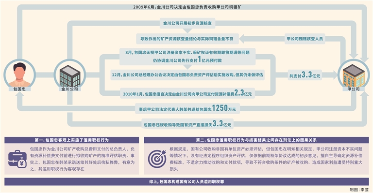 國有公司人員濫用職權(quán)罪。2009年6月,金川公司決定由包國忠負(fù)責(zé)收購甲公司銅鉬礦。同年7月,韓某承諾事成之后給予包國忠好處,于是包國忠違反國務(wù)院國資委《企業(yè)國有資產(chǎn)評估管理暫行辦法》、甘肅省國資委《履行出資人企業(yè)投資監(jiān)督管理暫行辦法》相關(guān)規(guī)定,未經(jīng)專業(yè)機(jī)構(gòu)評估探明儲量,僅依據(jù)取樣估算的儲量及品位,初步商定資源補(bǔ)償費(fèi)3.5億元。后金川公司開展初步資源核查,甲公司賄賂核查人員,導(dǎo)致作出的礦產(chǎn)資源核查量結(jié)論與實(shí)際銅鉬含量不符。同年8月,包國忠無視甲公司注冊資本不實(shí)、采礦權(quán)證有效期即將期滿等問題,仍協(xié)調(diào)金川公司先行支付1億元預(yù)付款。同年12月,金川公司總經(jīng)理辦公會議決定由包國忠負(fù)責(zé)資產(chǎn)評估后實(shí)施收購,但其仍未做評估。