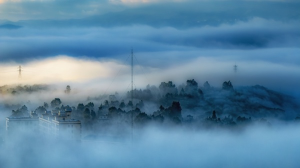 冬日清晨,朝陽初升。在晨曦的光暈中,晨霧似一層乳白色的輕紗籠罩著大理州祥云縣城,放眼望去宛如一幅水墨丹青畫卷。(戴國輝 攝)