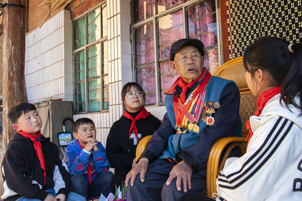 瀘西縣紀委監(jiān)委充分挖掘運用本地紅色資源中蘊涵的廉潔元素,正作風(fēng)、興黨風(fēng)、促民風(fēng)。圖為革命前輩為少先隊員講述紅色家風(fēng)故事。(肖燕斌 攝)