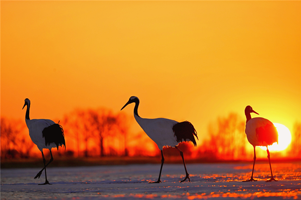夕陽西下,普洱太陽河國家公園的鶴群在落日余暉中悠閑踱步,享受著黃昏的清涼。(靳嶺 攝)