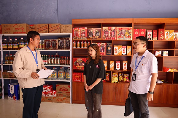 廣南縣紀委監委緊盯“雙節”節點,通過發布清廉警句、明察暗訪、隨機抽查等方式,全方位開展廉潔過節監督檢查,謹防黨員干部出現違規收送禮品禮金、公款購買煙酒、酒駕醉駕等問題。圖為該縣紀檢監察干部到煙酒專賣店查看是否存在公款購買情況。(楊明建 攝)