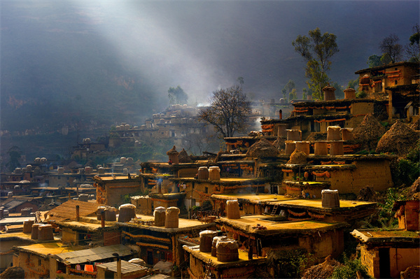 霜降時節,熙熙秋陽穿破山靄照向瀘西縣城子古村屋頂屋前,照亮了農家平實的生活,更曬出了物阜年豐的幸福人生。(康關福 攝)