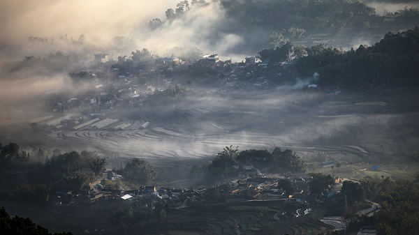 清晨在景東縣大街鎮熊洞山鳥瞰,伴隨著第一縷陽光的照射,者干河畔的村莊云霧朦朧,遠山層巒疊嶂若隱若現,在云霧的輕撫之下村莊顯得更加神秘而靜謐,勝似仙境,壯美無比。(吳永康 攝)