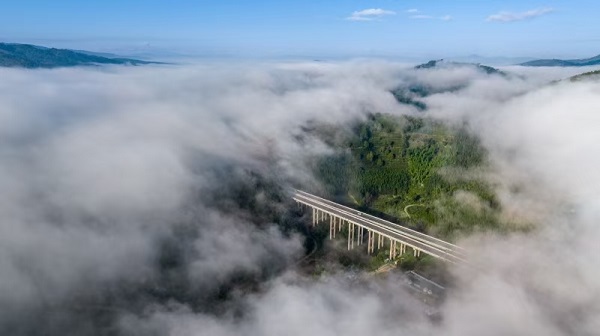 金秋十月,穿過西雙版納熱帶雨林的昆磨高速公路霧靄繚繞,仿佛是翡翠山巒中的“銀帶子”。(刀俊云 攝)