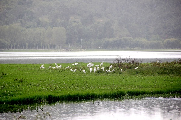 秋已暮,露成霜。姚安縣適宜的氣候吸引眾多鳥群在湖邊駐足、嬉戲,呈現出一幅幅生機盎然、溫馨和美的動人畫面。(布春進 攝)