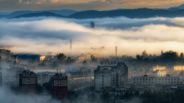 在晨曦的光暈中,晨霧似一層乳白色的輕紗籠罩著大理州祥云縣城,樓宇在其間若隱若現(xiàn),猶如仙臺(tái)樓閣,如詩如畫。(戴國(guó)輝 攝)