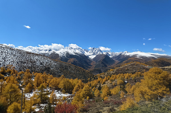 立冬時(shí)節(jié),位于迪慶州德欽縣境內(nèi)的白馬雪山換上了金黃、火紅、瑩白相間的艷麗服飾,仿佛是季節(jié)的筆觸在大地上繪出斑斕的畫卷。(和云舞 攝)
