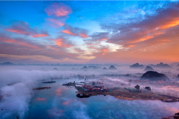 初冬的清晨,裊裊薄霧,輕盈如羽衣,在密境普者黑的山間、水面彌漫飄蕩著,漸漸隱沒了村莊,等待著第一束陽光。(馬俊勇 攝)