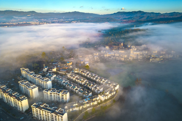 小雪時(shí)節(jié),牟定縣的茅州城在淡淡的霧氣中蘇醒,層巒疊嶂、錯落有致的樓房披上了一層薄紗。(李林先 攝)