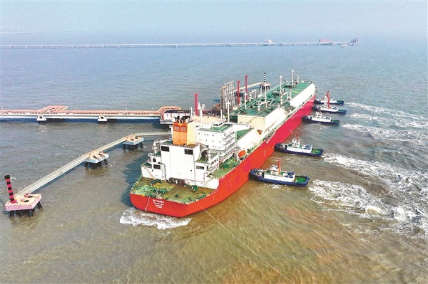 習近平總書記在省部級主要領導干部學習貫徹黨的二十屆三中全會精神專題研討班開班式上的重要講話,激勵廣大干部群眾鼓足干勁、勇毅前行,推動各項改革舉措精準落地見效,奮力打開改革發展新天地。圖為近日,國家石油天然氣基礎設施建設重點工程中國石油唐山LNG(液化天然氣)接收站正進行LNG運輸船??俊P氯A社記者 楊世堯 攝