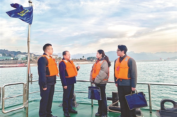 湖北省秭歸縣紀委監委緊盯自然資源領域腐敗和作風問題,將三峽庫區生態修復納入政治監督重點,以有力監督守護三峽庫區綠水青山。圖為該縣紀檢監察干部在三峽大壩上游水域了解相關情況。鄭玉涵 攝