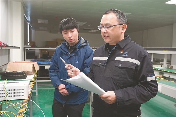 圖為霞浦核電維修處儀控科自控一班班長(zhǎng)譚勇(右)和同事圍繞設(shè)備故障問(wèn)題進(jìn)行實(shí)驗(yàn)討論。 霞浦核電供圖