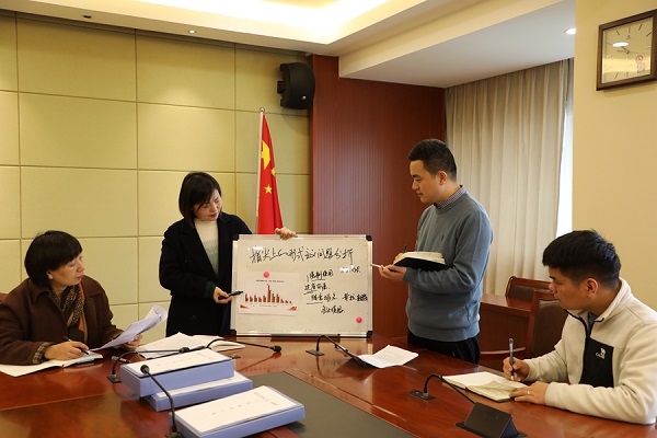 浙江省金華市紀委監委聚焦“指尖上的形式主義”,成立工作專班,開展專項整治,切實為基層減負松綁。圖為工作專班人員對“指尖上的形式主義”問題進行分析。 王妃 攝