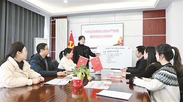 河南省洛陽市偃師區紀委監委將學習新修訂的紀律處分條例作為今年紀律教育的“第一課”,推動紀檢監察干部深刻認識修訂紀律處分條例的重要意義和豐富內涵,將學習成果內化于心、外化于行。圖為該區紀委監委機關第五黨支部組織學習新修訂的紀律處分條例。 牛光衛 攝