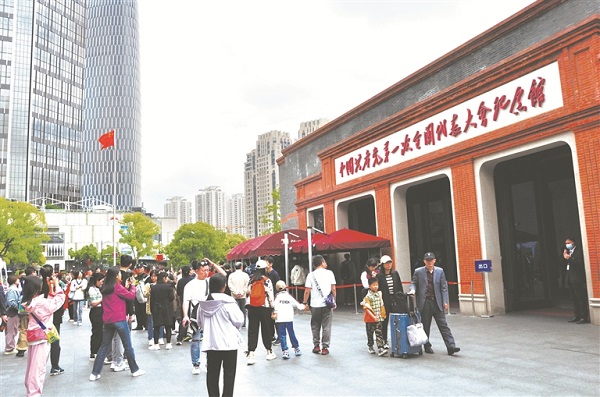 近日,眾多游客在上海市中共一大會(huì)址紀(jì)念館排隊(duì)參觀,瞻仰合影留念。 圖片來源:視覺中國