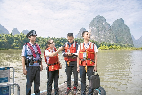圖為廣西壯族自治區桂林市紀檢監察干部在陽朔縣興坪鎮檢查漓江流域生態環境保護突出問題整治情況。 夏立慧 攝