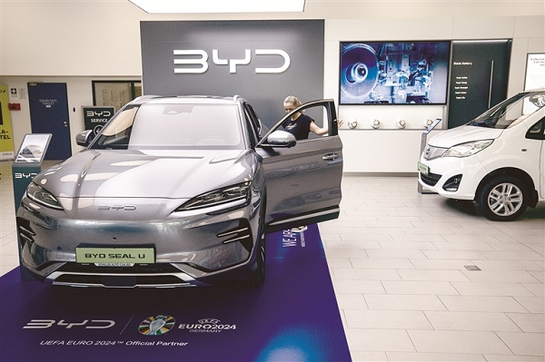 近日,在匈牙利布達(dá)佩斯的比亞迪汽車展廳,消費(fèi)者正在體驗(yàn)一輛比亞迪電動(dòng)汽車。 圖片來源:視覺中國