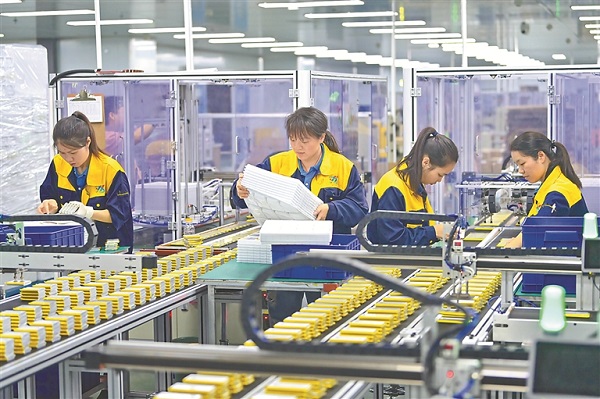 近日,江西省永新縣工業(yè)開發(fā)區(qū)的某鋰電池生產(chǎn)車間內(nèi),工人在生產(chǎn)線上包裝出口非洲國家市場(chǎng)的消費(fèi)類鋰電池產(chǎn)品。 圖片來源:視覺中國