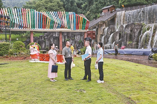江西省上栗縣紀委監委組織力量深入酒店、景區等重點場所,實地察訪借培訓、招商、考察等名義公款旅游問題。圖為6月27日,該縣紀檢監察干部在轄區某風景名勝區了解情況。 易成 攝