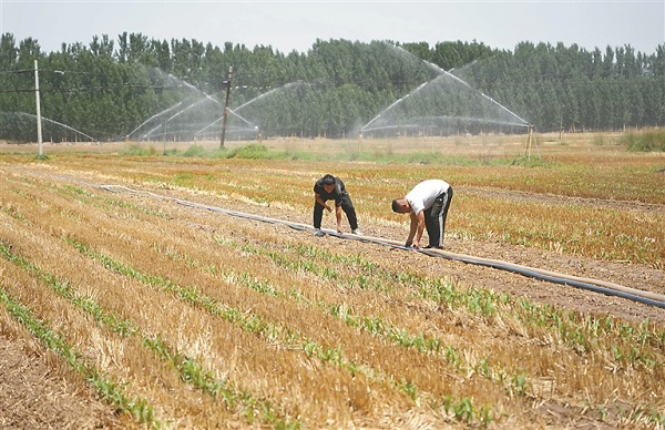 入夏以來,山東省持續(xù)高溫少雨,多地旱情加劇。針對旱情,山東各地采取擴大引黃水量、推廣節(jié)水灌溉、增加農(nóng)用機電井等辦法,積極抗旱保夏種。圖為近日,在臨邑縣孟寺鎮(zhèn),村民在鋪設(shè)灌溉用管道。 新華社記者 徐速繪 攝