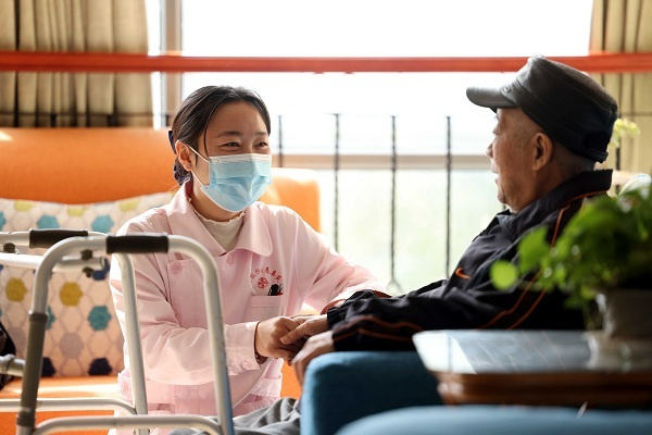 安徽省合肥市瑤海區靜安養親苑護理人員在陪老人聊天。新華社發 解琛 攝