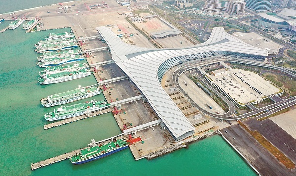 海南省始終堅持以高水平開放服務國家戰(zhàn)略大局、推動高質(zhì)量發(fā)展,以“貿(mào)易、投資、跨境資金流動、人員進出、運輸來往自由便利和數(shù)據(jù)安全有序流動”為主框架的自由貿(mào)易港政策制度體系已初步建立,自由貿(mào)易港建設成形起勢,不斷讓經(jīng)營主體和群眾得到了真金白銀的實惠。圖為海口新海滾裝碼頭客運綜合樞紐站項目,是海南自貿(mào)港封關(guān)運作的重要配套設施。 新華社記者 郭程 攝