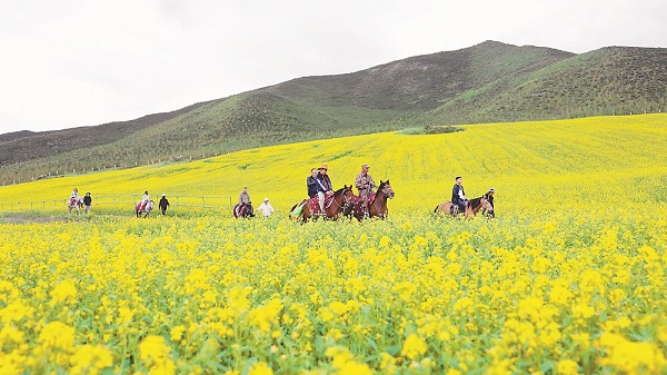我國生態(tài)文明體制改革加快推進,生態(tài)環(huán)境保護發(fā)生歷史性、轉(zhuǎn)折性、全局性變化,美麗中國建設邁出重大步伐。“綠水青山就是金山銀山”理念已經(jīng)成為全黨全社會的共識和行動,圖為7月13日,游客騎馬游覽甘肅省張掖市民樂縣扁都口生態(tài)景區(qū)油菜花海。 新華社發(fā)(成林 攝)