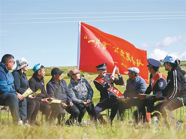 全民普法和守法是全面依法治國的長期基礎性工作。各地各部門緊緊圍繞黨和國家工作大局,持續深化實化普法為民工作質效,在增強法治宣傳教育的針對性、實效性上下功夫,努力使尊法學法守法用法在全社會蔚然成風。圖為近日,新疆維吾爾自治區阿勒泰地區,當地民警向牧民普及法律知識。 圖片來源:視覺中國