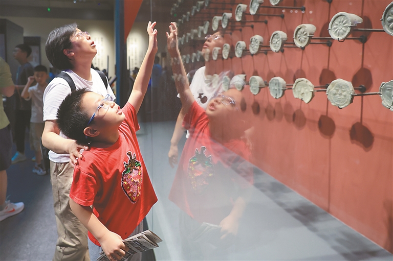 暑假期間,許多家長帶著孩子到南京六朝博物館參觀游覽,學習歷史文化知識,豐富暑期生活。圖為近日,一位家長陪孩子在南京六朝博物館參觀。 圖片來源:視覺中國