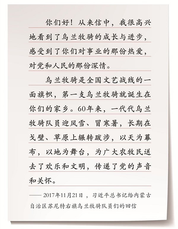 2017年11月21日,習(xí)近平總書(shū)記在給蘇尼特右旗烏蘭牧騎隊(duì)員們的回信中指出:“大力弘揚(yáng)烏蘭牧騎的優(yōu)良傳統(tǒng),扎根生活沃土,服務(wù)牧民群眾,推動(dòng)文藝創(chuàng)新,努力創(chuàng)作更多接地氣、傳得開(kāi)、留得下的優(yōu)秀作品,永遠(yuǎn)做草原上的‘紅色文藝輕騎兵’。”