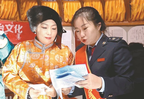 烏蘭牧騎隊(duì)以鮮活多樣的文藝形式宣傳黨的理論、政策,豐富農(nóng)牧民群眾的精神文化生活,把黨的聲音與關(guān)懷送到千家萬(wàn)戶。圖為蘇尼特右旗烏蘭牧騎隊(duì)員在“憲法邊疆行”主題活動(dòng)上表演完節(jié)目后,為牧民群眾發(fā)放有關(guān)宣傳資料并進(jìn)行講解。 蘇尼特右旗烏蘭牧騎供圖