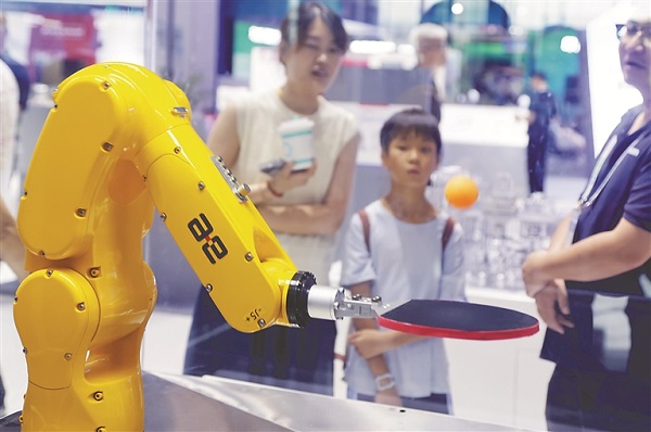 7月13日至16日,第二十六屆中國北京國際科技產(chǎn)業(yè)博覽會在北京國家會議中心舉行。本屆科博會共設(shè)置信息科技、智能制造、數(shù)字經(jīng)濟(jì)和區(qū)域創(chuàng)新發(fā)展等6個專題展區(qū),展示最新科技創(chuàng)新成果和發(fā)展趨勢。圖為7月14日,觀眾在科博會上觀看一款運(yùn)動機(jī)器人。 新華社記者 潘旭 攝
