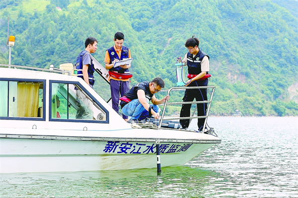 在安徽省黃山市歙縣街口鎮,來自安徽省黃山生態環境監測中心和浙江省杭州生態環境監測中心的工作人員在新安江流域跨省界斷面采集聯測水樣,實時監測水質動態。 新華社發(樊成柱 攝)