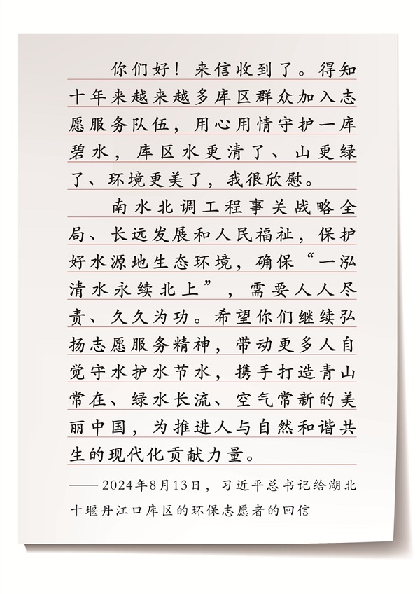 最近,習(xí)近平總書(shū)記給湖北十堰丹江口庫(kù)區(qū)的環(huán)保志愿者回信強(qiáng)調(diào),南水北調(diào)工程事關(guān)戰(zhàn)略全局、長(zhǎng)遠(yuǎn)發(fā)展和人民福祉,保護(hù)好水源地生態(tài)環(huán)境,確保“一泓清水永續(xù)北上”,需要人人盡責(zé)、久久為功。希望你們繼續(xù)弘揚(yáng)志愿服務(wù)精神,帶動(dòng)更多人自覺(jué)守水護(hù)水節(jié)水,攜手打造青山常在、綠水長(zhǎng)流、空氣常新的美麗中國(guó),為推進(jìn)人與自然和諧共生的現(xiàn)代化貢獻(xiàn)力量。