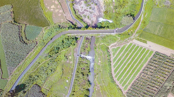 重慶秀山巨豐堰利用平江河的自然落差以及所需灌溉范圍分級攔河引水,通過三層“立交”模式實現了高水高用、低水低用。圖為秀山巨豐堰獨特的“渠—渠—河”三層“立交”景象。廖學勇 攝