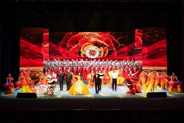 文藝展演結束,全場起立,共同高唱《歌唱祖國》,熱烈掌聲經久不息。