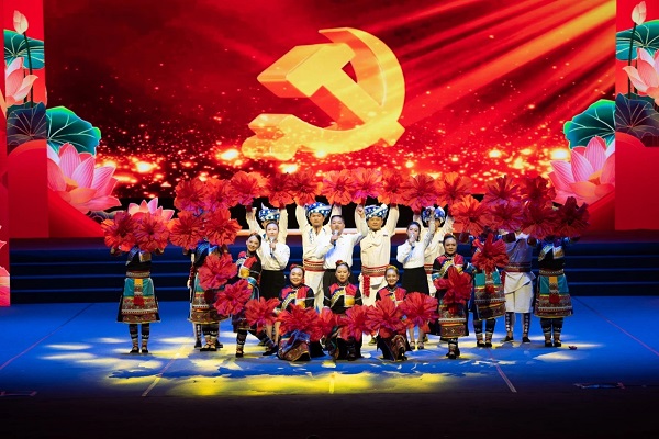 “沒有共產黨就沒有新中國,沒有共產黨就沒有新中國,共產黨辛勞為民族,共產黨他一心救中國……”伴隨著陣陣鼓聲,表演唱《沒有共產黨就沒有新中國》將演出氣氛推向高潮。