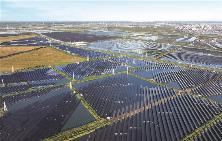 圖為近日拍攝的河北省唐山市豐南區黑沿子鎮一處“漁光互補”發電場和風電場遙相呼應的場景。新華社記者 楊世堯 攝