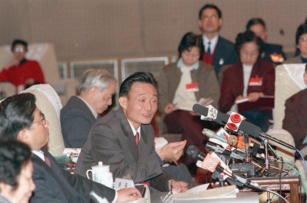 1994年3月,時(shí)任上海市委書(shū)記的吳邦國(guó)同志在全國(guó)兩會(huì)上海代表團(tuán)全團(tuán)會(huì)議上。新華社記者 劉建國(guó) 攝