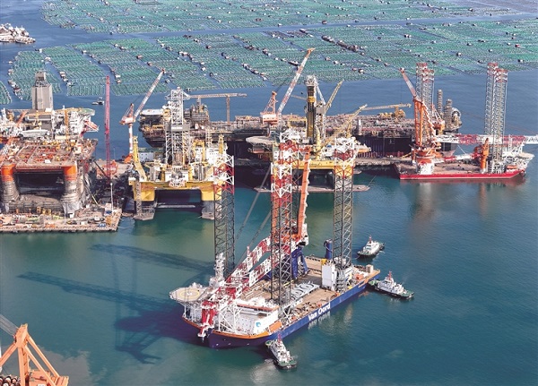 10月18日,國家統計局發布數據顯示,初步核算,前三季度我國國內生產總值(GDP)949746億元,按不變價格計算,同比增長4.8%,國民經濟運行穩中有進,向好因素累積增多。圖為10月16日,在中集來福士山東煙臺建造基地,多型海工裝備和特種船舶在進行建造和測試。新華社發(唐克 攝)
