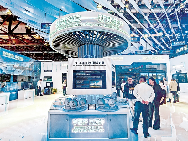 近日,中國國際信息通信展覽會上,觀眾正在參觀亨通光電“全球燈塔工廠”展臺。 圖片來源:視覺中國